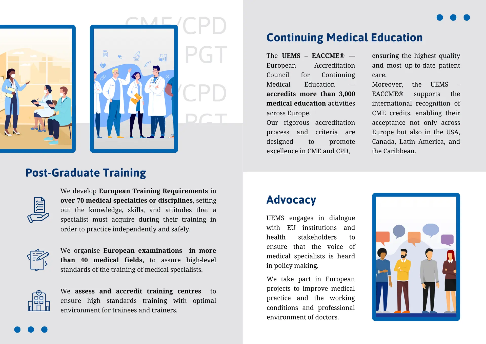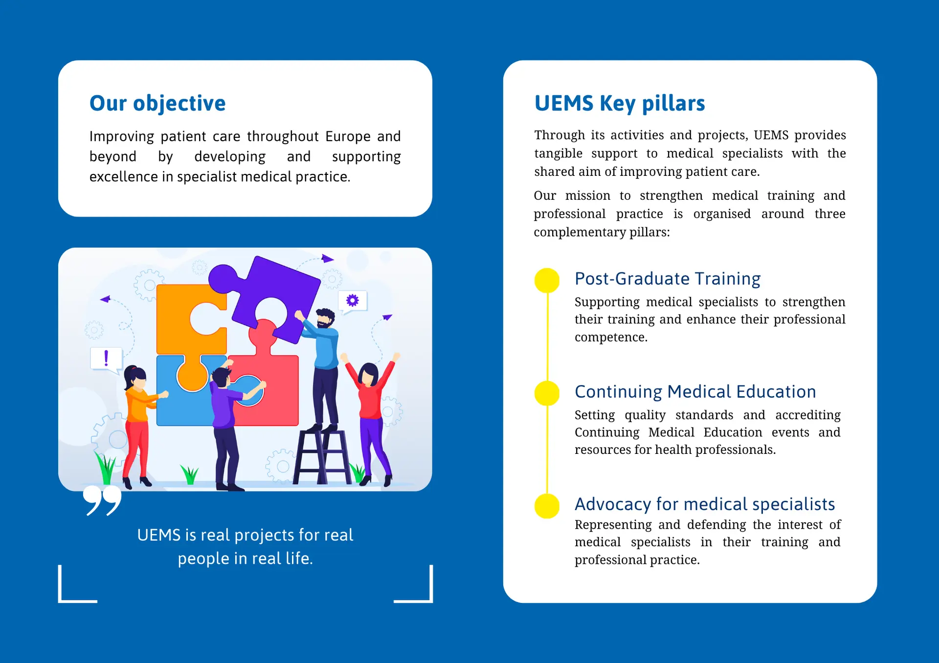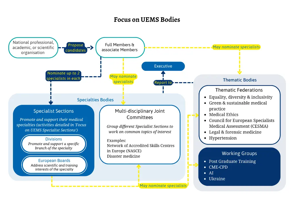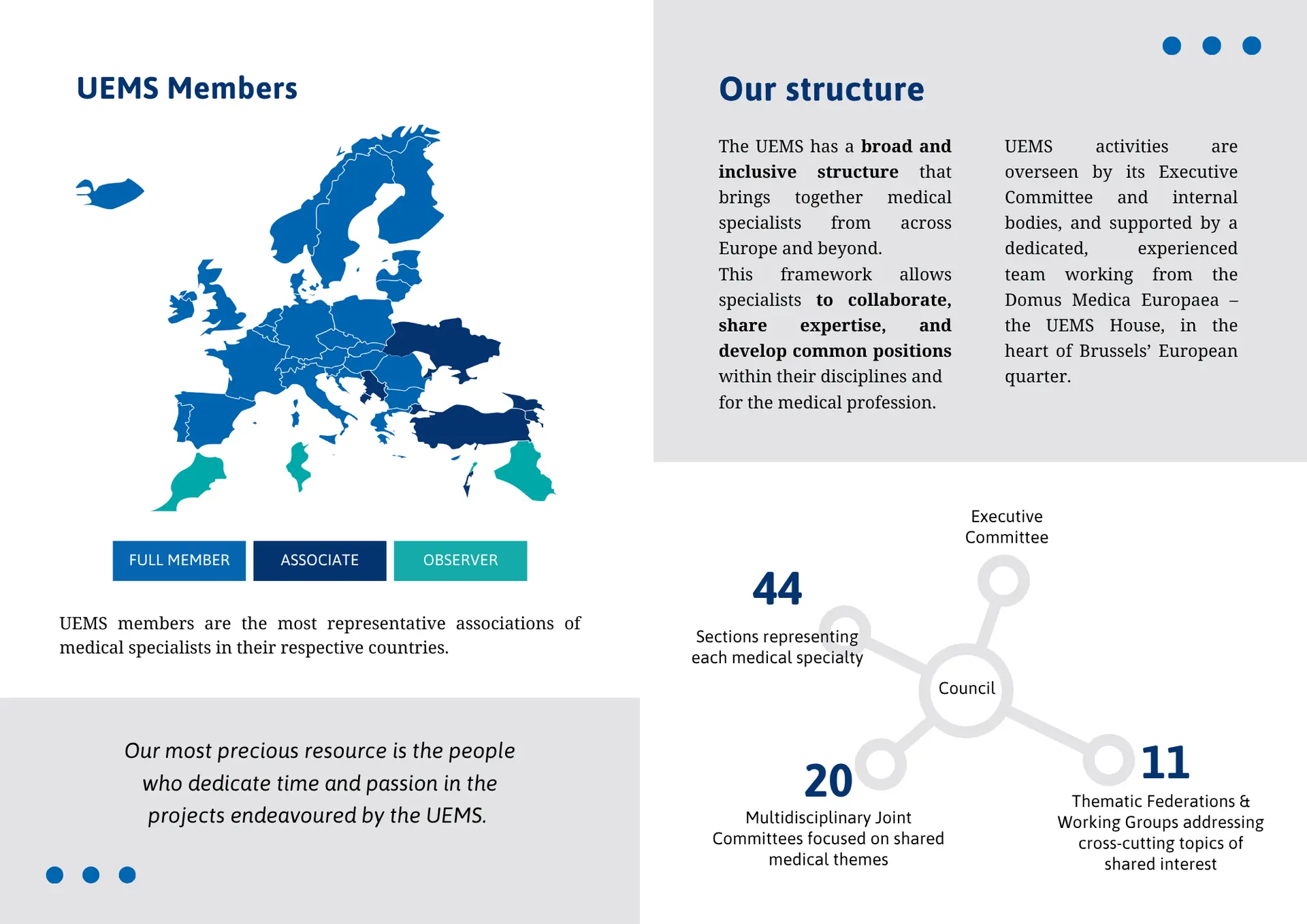 The UEMS has a wide structure with many internal bodies ensuring independence, but close collaboration between its Specialists Sections, and Multidisciplinary Joint Committees.